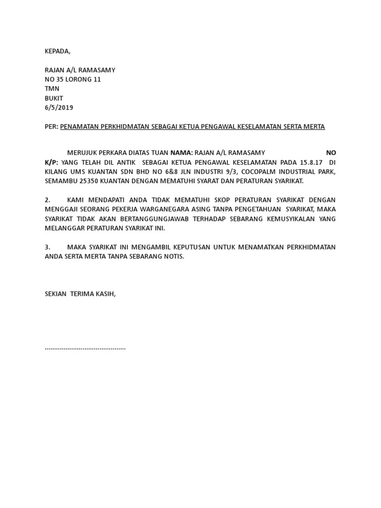 Surat ini mengesahkan pemecatan anda dari Syarikat Ernesto kerana prestasi buruk berkuat kuasa serta-merta. Syarikat dengan ini menasihatkan anda supaya mematuhi peraturan masa tiba ke. Contoh surat tunjuk sebab majikan dan pekerja contoh resume terkini undang undang buruh.